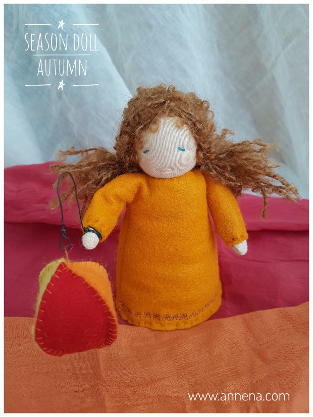 Autumn has started, the nachlieli bird has been spotted and the chatsav flower is blooming. For the kindergarten and for at home I made an autumn lady for on the season table, she is surrounded by colorful acorns and a mushroom. The first rain fell and it is getting colder, we love the change in weather!